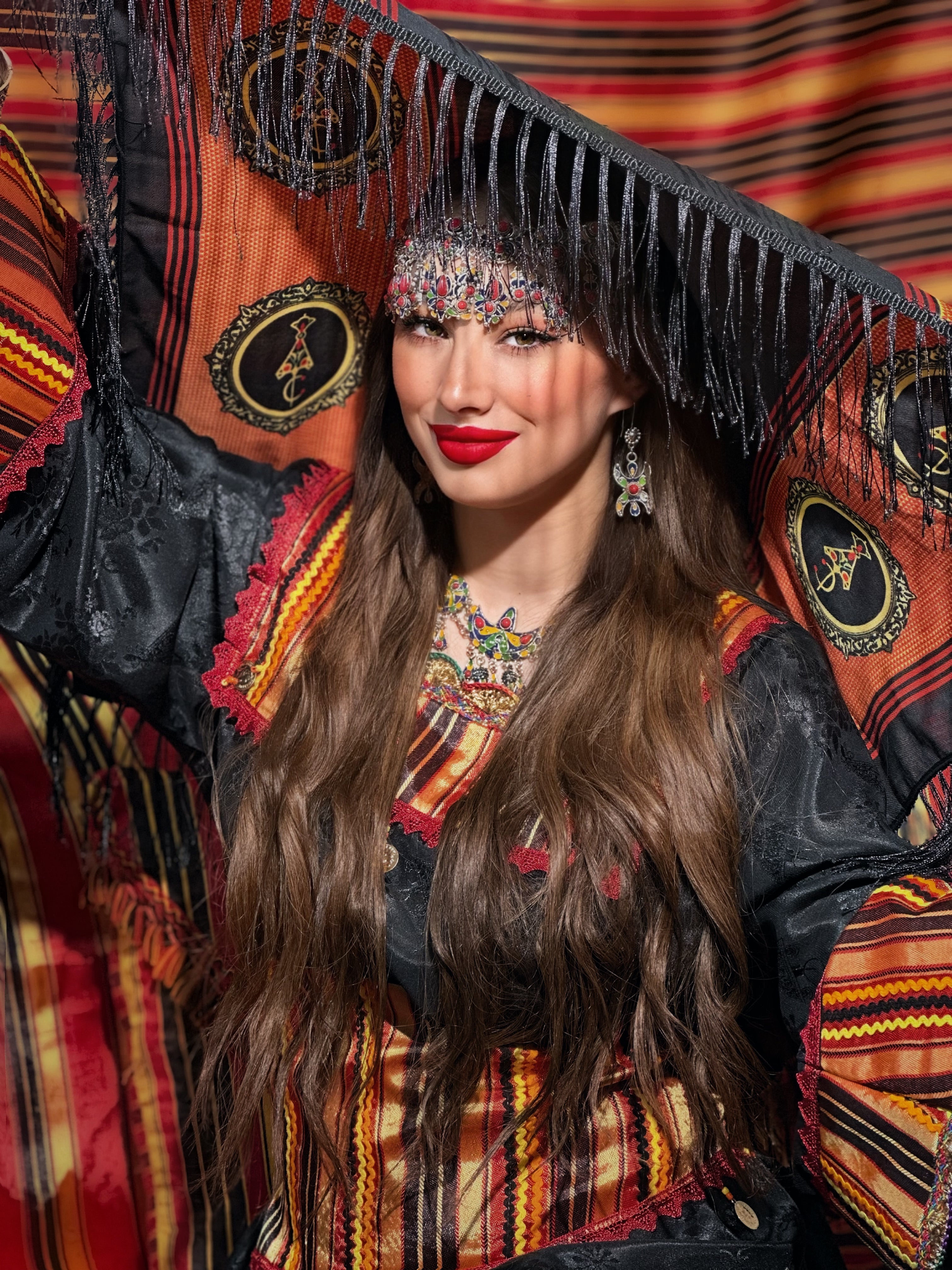 Robe kabyle moderne en soie premium, sublimée par un tissu kabyle multicolore au niveau du corsage, des manches et de la ceinture.